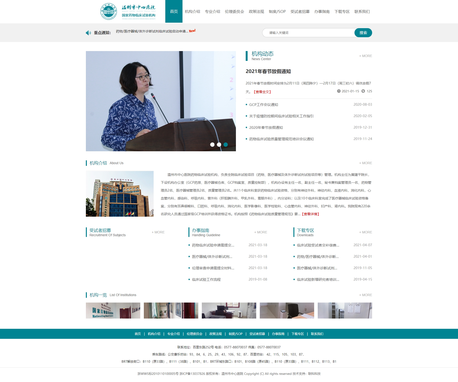 溫州市中心醫(yī)院藥物臨床試驗機構,負責全院臨床試驗項目(藥物、醫(yī)療器械及體外診斷試劑等)管理。機構主任為黃建平書記,機構副主任張立群院長,下設機構辦公室(GCP藥房、醫(yī)療器械倉庫、GCP檔案室、質(zhì)量控制部),機構辦設有主任1名、副主任1名、秘書兼資料管理員1名、藥物管理員2名、醫(yī)療器械管理員2名、質(zhì)量管理員2名。共11個臨床科室獲藥物臨床試驗資格,分別有神經(jīng)外科,神經(jīng)內(nèi)科,血液內(nèi)科,消化內(nèi)科,心血管內(nèi)科,感染科, 呼吸內(nèi)科,普外科(肝膽胰外科,甲乳外科,胃腸外科),內(nèi)分泌科。