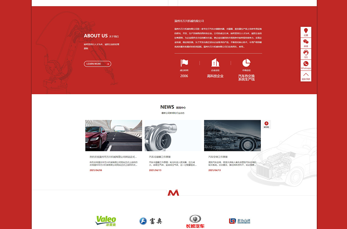 溫州市萬興機械有限公司是一家專注于汽車水箱散熱器、冷凝器、蒸發(fā)器生產(chǎn)線上各種專用設(shè)備的研究、開發(fā)、生產(chǎn)及銷售的高科技企業(yè)。公司自成立以來,始終堅持以人才為本、誠信立業(yè)的經(jīng)營原則,為企業(yè)提供全方位的解決方案,使企業(yè)在激烈的市場競爭中始終保持競爭力,實現(xiàn)企業(yè)快速、穩(wěn)定地發(fā)展。為了開發(fā)出真正適合企業(yè)需求的產(chǎn)品,不斷優(yōu)化核心技術(shù),令用戶得到優(yōu)質(zhì)的服務(wù)和好的投資回報。