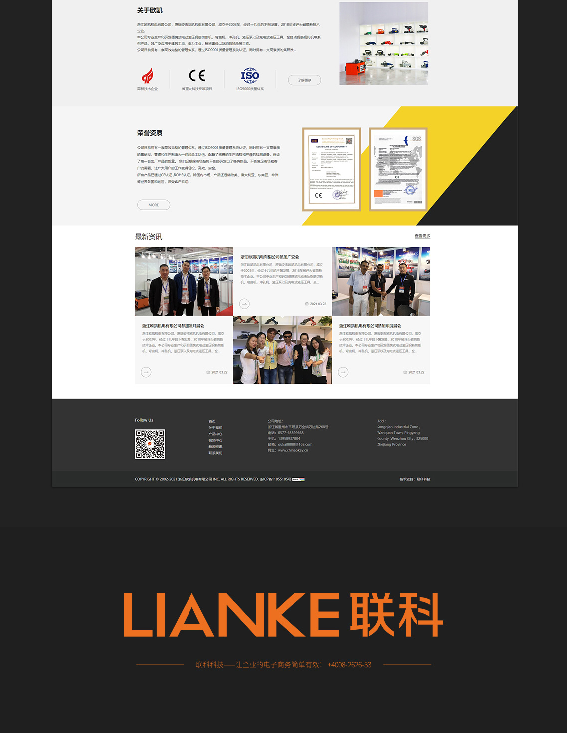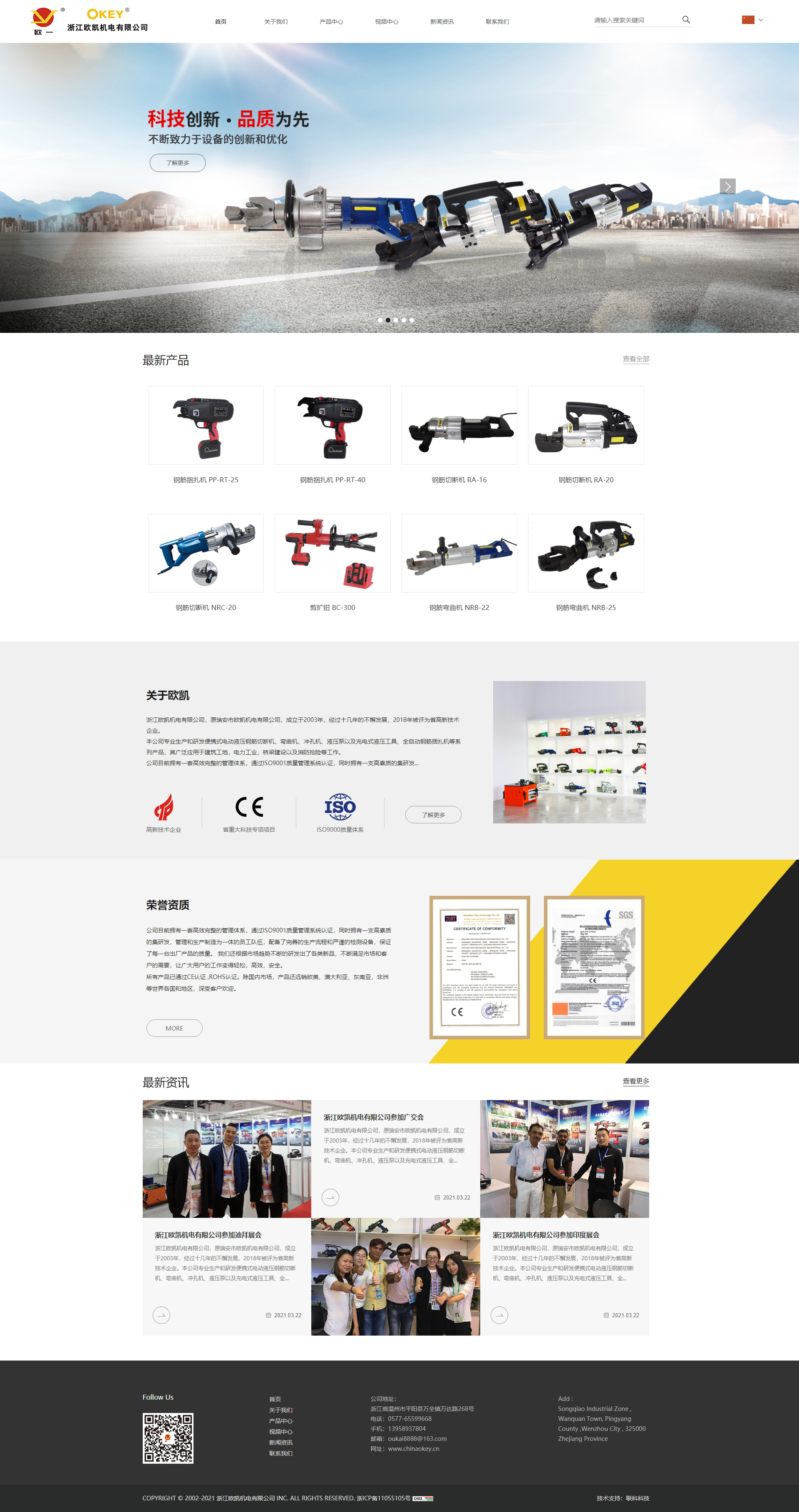 浙江歐凱機(jī)電有限公司,原瑞安市歐凱機(jī)電有限公司,成立于2003年,經(jīng)過十幾年的不懈發(fā)展,2018年被評(píng)為省高新技術(shù)企業(yè)。本公司專業(yè)生產(chǎn)和研發(fā)便攜式電動(dòng)液壓鋼筋切斷機(jī)、彎曲機(jī)、沖孔機(jī)、液壓泵以及充電式液壓工具、全自動(dòng)鋼筋捆扎機(jī)等系列產(chǎn)品,其廣泛應(yīng)用于建筑工地,電力工業(yè),橋梁建設(shè)以及消防搶險(xiǎn)等工作。