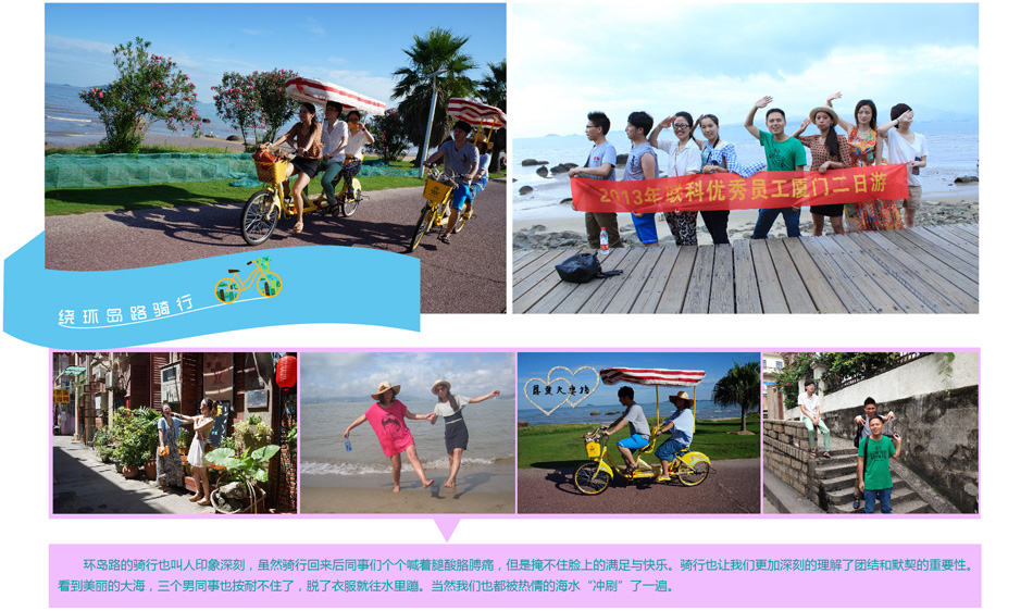 2013年6月22日,為了給員工創(chuàng)造一個(gè)放松機(jī)會(huì),我公司后勤部全體工作人員和部分技術(shù)部工作人員前往世界聞名的"海上花園"城市廈門體驗(yàn)夏季休閑之旅。本次旅游活動(dòng)主要有以下幾個(gè)環(huán)節(jié),它們分別是品嘗廈門特色小吃,繞環(huán)島路騎行,體驗(yàn)海風(fēng)及海水的清涼,乘坐輪渡享受海風(fēng),欣賞鼓浪嶼的百國建筑群,品味廈門休閑生活的節(jié)奏。22日中午,我們抵達(dá)廈門,按照原本的計(jì)劃逐一體驗(yàn)。