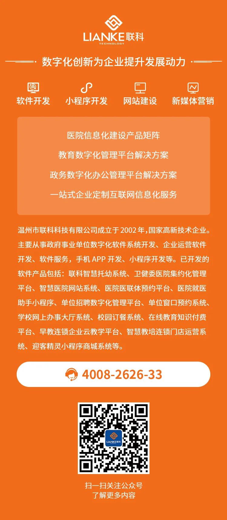 聯(lián)科自成立以來(lái)已有多年歷程,在服務(wù)醫(yī)療體系,構(gòu)建互聯(lián)網(wǎng)醫(yī)院的過(guò)程中我們積累了豐富的行業(yè)經(jīng)驗(yàn)和專業(yè)知識(shí)。我們以大氣的海報(bào)設(shè)計(jì)、便捷的服務(wù)體驗(yàn)、實(shí)力雄厚的專家科室、全面的新聞資訊以及創(chuàng)新的特色診療為核心競(jìng)爭(zhēng)力,致力于為用戶提供高品質(zhì)、全方位的服務(wù)。我們將繼續(xù)秉承“大氣、便民、專業(yè)、創(chuàng)新”的理念,不斷提升醫(yī)院的綜合實(shí)力和服務(wù)水平,為廣大患者提供更加優(yōu)質(zhì)、高效的醫(yī)療服務(wù)。