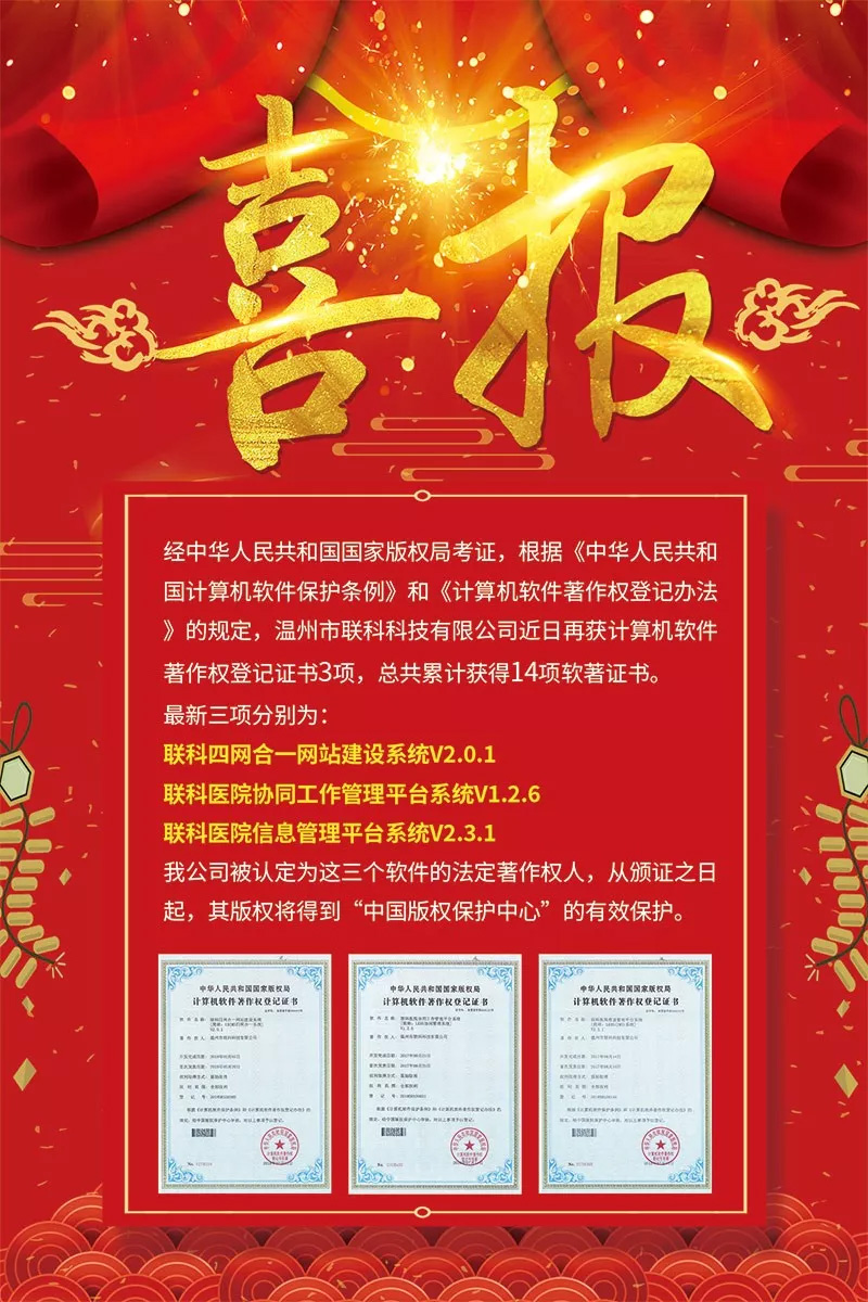 經(jīng)中華人民共和國國家版權(quán)局考證,根據(jù)《中華人民共和國計算機軟件保護條例》和《計算機軟件著作權(quán)登記辦法》的規(guī)定,溫州市聯(lián)科科技有限公司近日取得計算機軟件著作權(quán)登記證書3項。