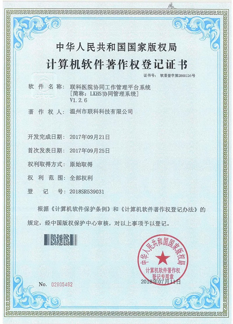 《聯(lián)科醫(yī)院協(xié)同工作管理平臺系統(tǒng)V1.2.6》于2018年07月11日被正式授予《中華人民共和國國家版權(quán)局計算機軟件著作權(quán)登記證書》,登記號為2018SR539031。