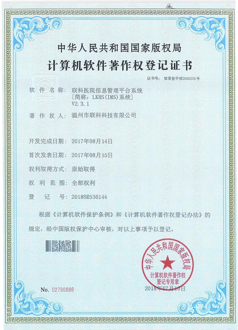 《聯(lián)科醫(yī)院信息管理平臺系統(tǒng)V2.3.1》于2018年07月10日被正式授予《中華人民共和國國家版權(quán)局計算機軟件著作權(quán)登記證書》,登記號為2018SR536144。