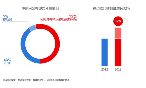 在這份報(bào)告中,我們不難看出PC與移動(dòng)的同步發(fā)展是未來(lái)的一大趨勢(shì),就拿2012年與2013年的移動(dòng)端網(wǎng)站的情況對(duì)比,2013年的移動(dòng)端網(wǎng)站數(shù)量增加了32%,而這一數(shù)據(jù)還保持著快速增長(zhǎng)的發(fā)展趨勢(shì)。