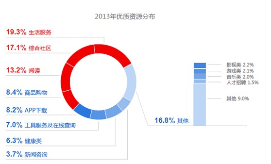 雖然,移動(dòng)端網(wǎng)站、移動(dòng)端服務(wù)沒(méi)有完善的服務(wù)體系,尚處于發(fā)展的上坡路之中,仍舊有一些企業(yè)能夠做出一些優(yōu)質(zhì)的移動(dòng)端資源,而這些優(yōu)質(zhì)資源主要是集中在生活服務(wù)類、綜合社區(qū)類、閱讀、商品購(gòu)物、APP下載,不僅占比最高而且增速明顯,如圖中的數(shù)據(jù)顯示可以看出。